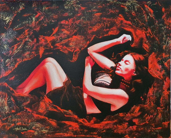 Kunsten min kombinerer energi og stillhet - kontraster som åpner for tolkning. Jeg utforsker øyeblikket før noe skjer, blikket som forteller en historie, og følelsen av å være mellom virkelighet og drøm.