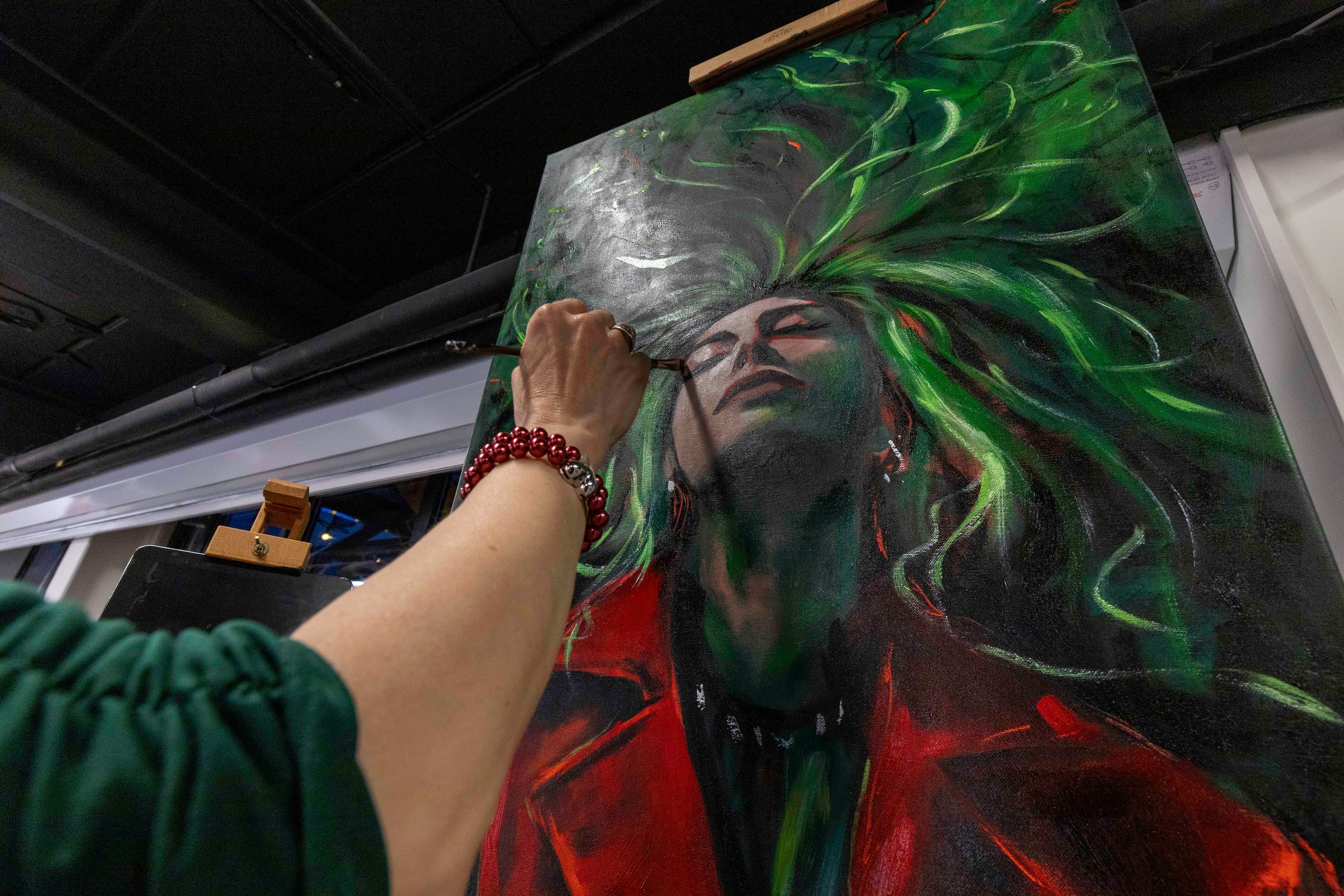 Fargene overdriver jeg ofte bevisst - de blir sterkere enn det helt naturlige - for å forsterke følelsene og budskapet i portrettet. Gjennom denne prosessen, fra første skisse til siste penselstrøk, vokser ideen frem til et ferdig verk som formidler den indre styrken og sårbarheten jeg søker å synliggjøre gjennom hvert penselstrøk utforsker jeg både min egen og andres indre landskap.