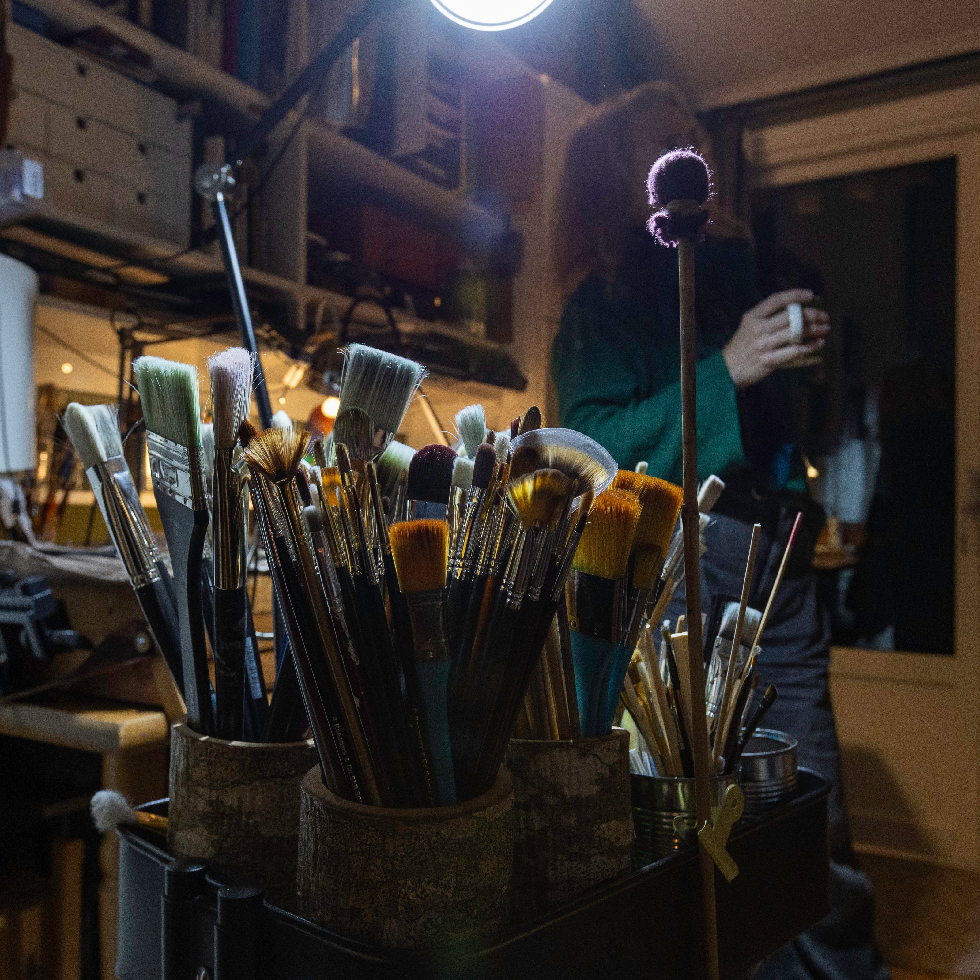 Jeg starter med røffe skisser direkte på lerretet, og bygger deretter maleriet opp lag på lag. Pensler og farger velges bevisst for å skape akkurat den følelsen, teksturen eller illusjonen jeg er ute etter. Lerretets egen struktur blir en del av uttrykket.